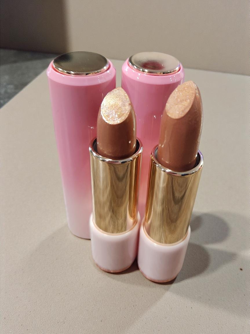 Siren's Treasure is muted golden shimmer with very slight pinkish undertones, giving it a radiant, sunlit glow. It goes on creamy and feels just like a lip treatment rather than a lipstick. This is a perfect color to be worn alone or over a matte shade to add shimmer and warmth!