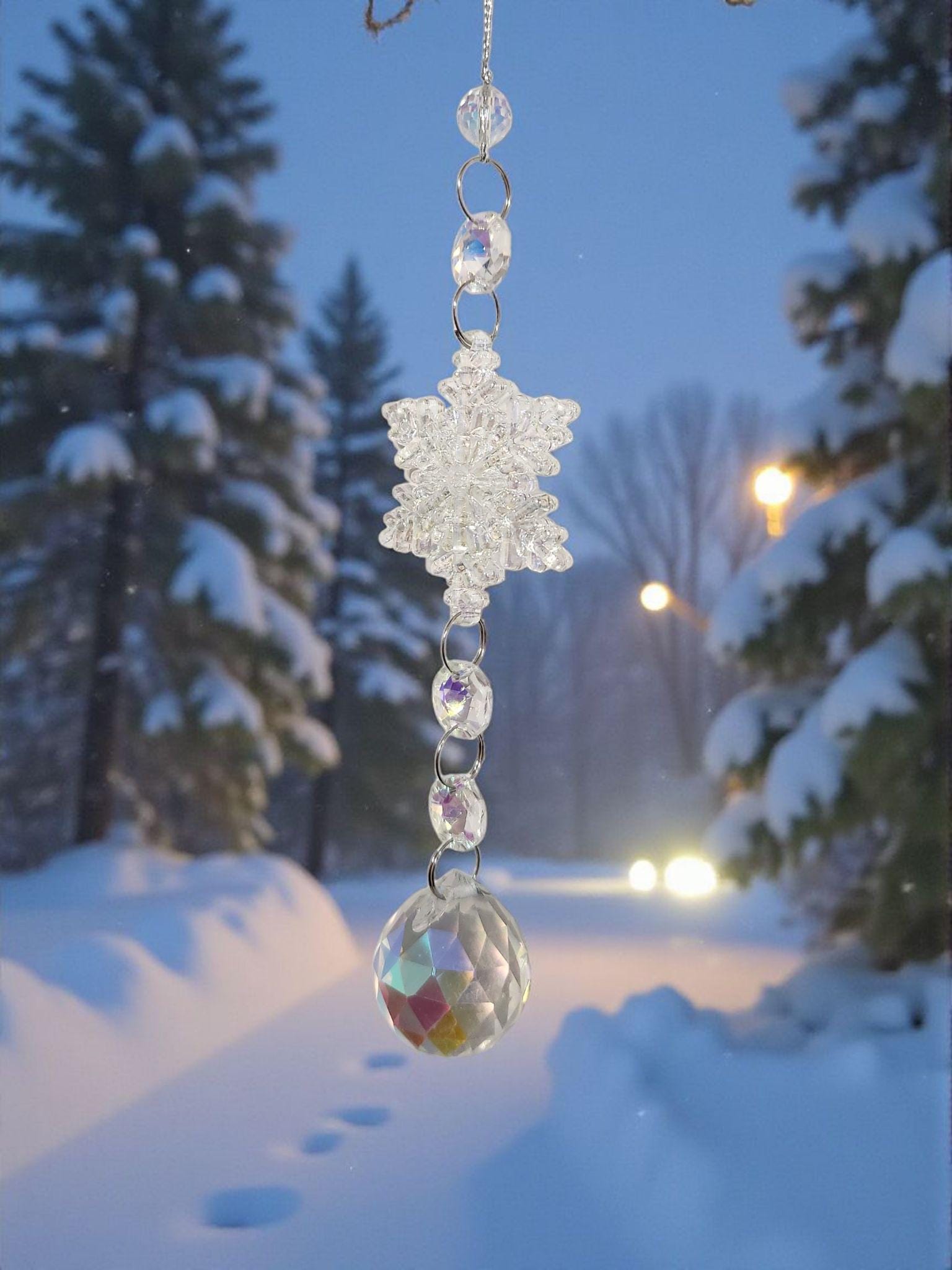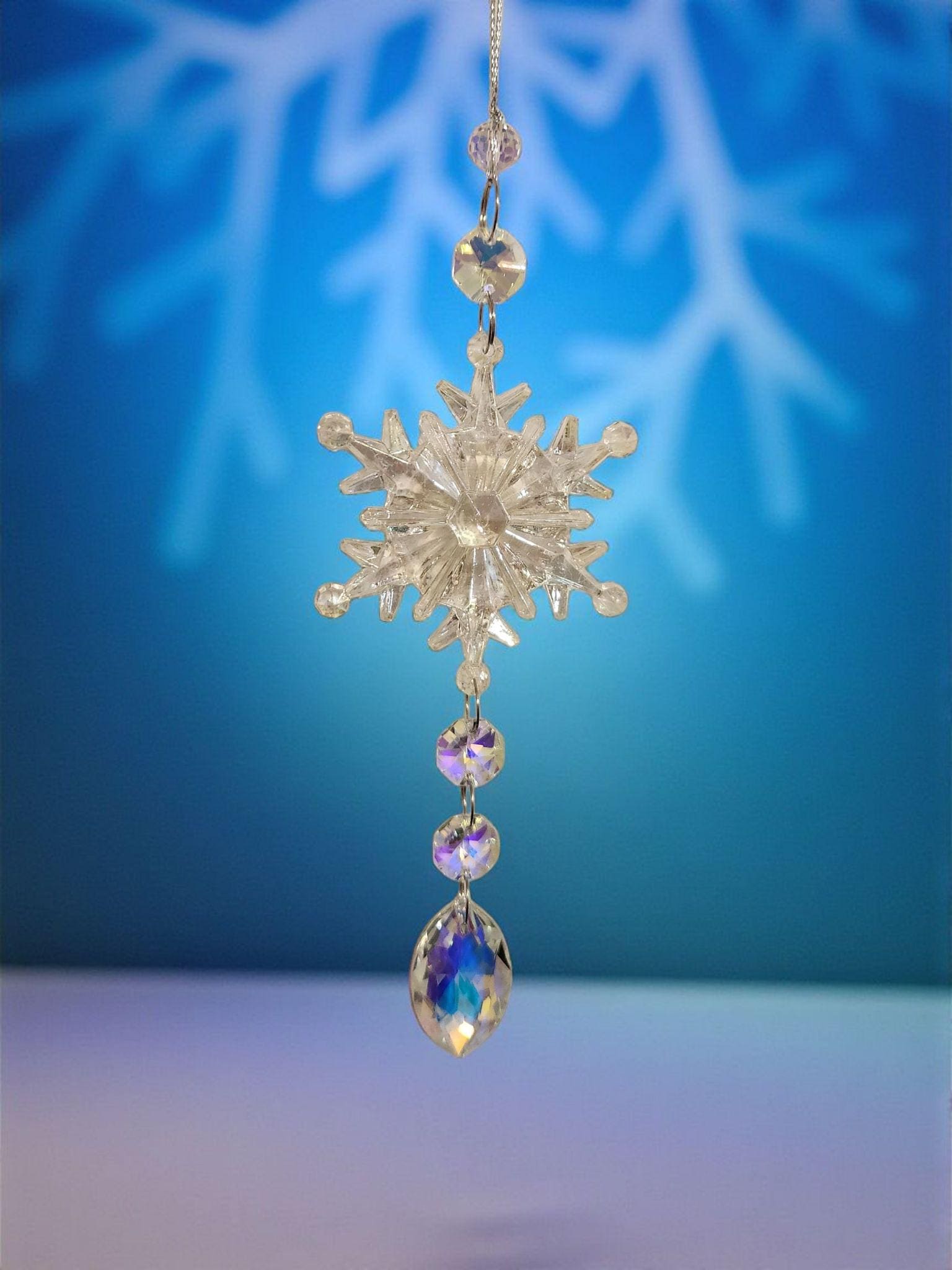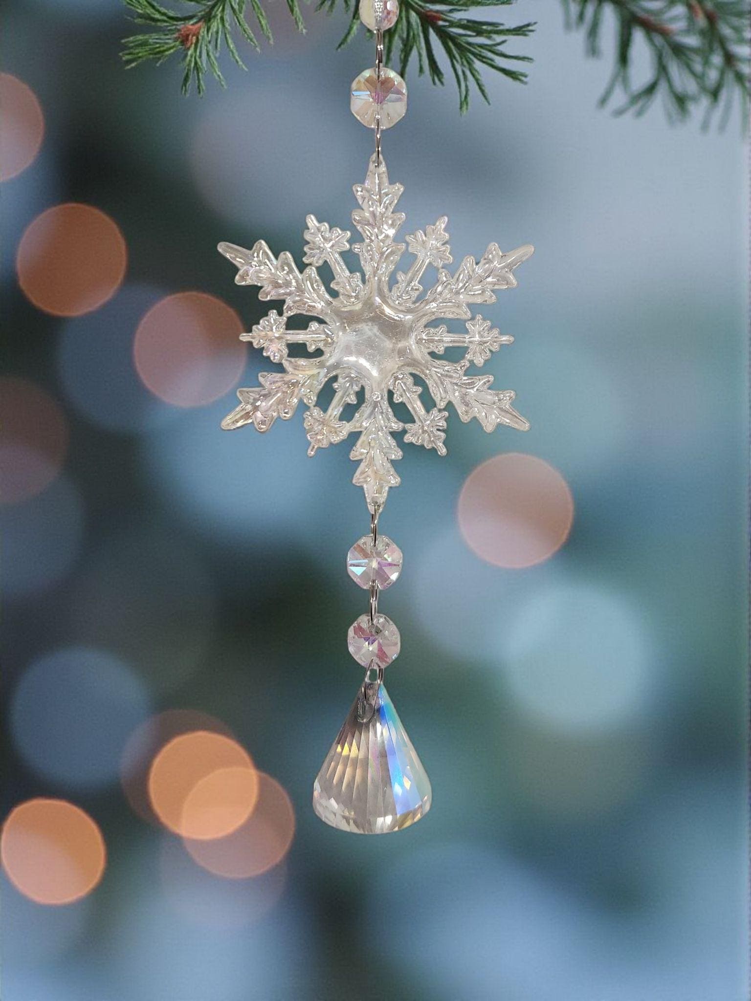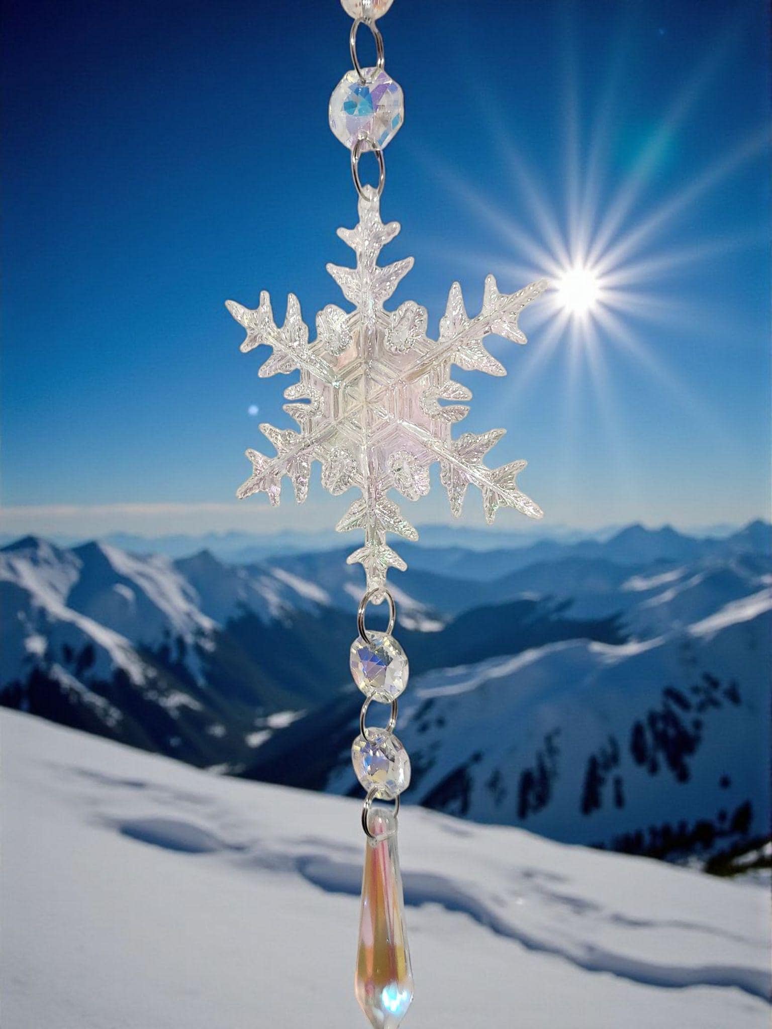 Bring the magic of winter indoors with these breathtaking crystal snowflake ornaments, delicately crafted to shimmer and sparkle in every ray of light. Each ornament features a clear, faceted snowflake centerpiece, accented with iridescent crystal beads and a radiant drop prism that captures and scatters sunlight into a spectrum of colors.