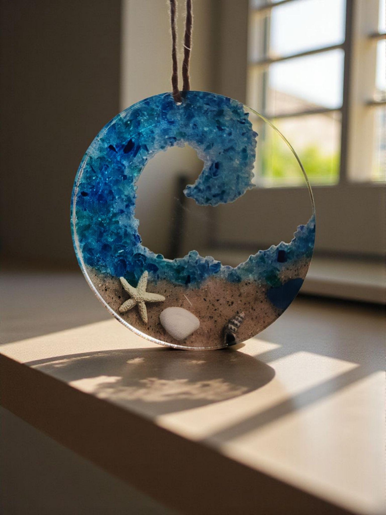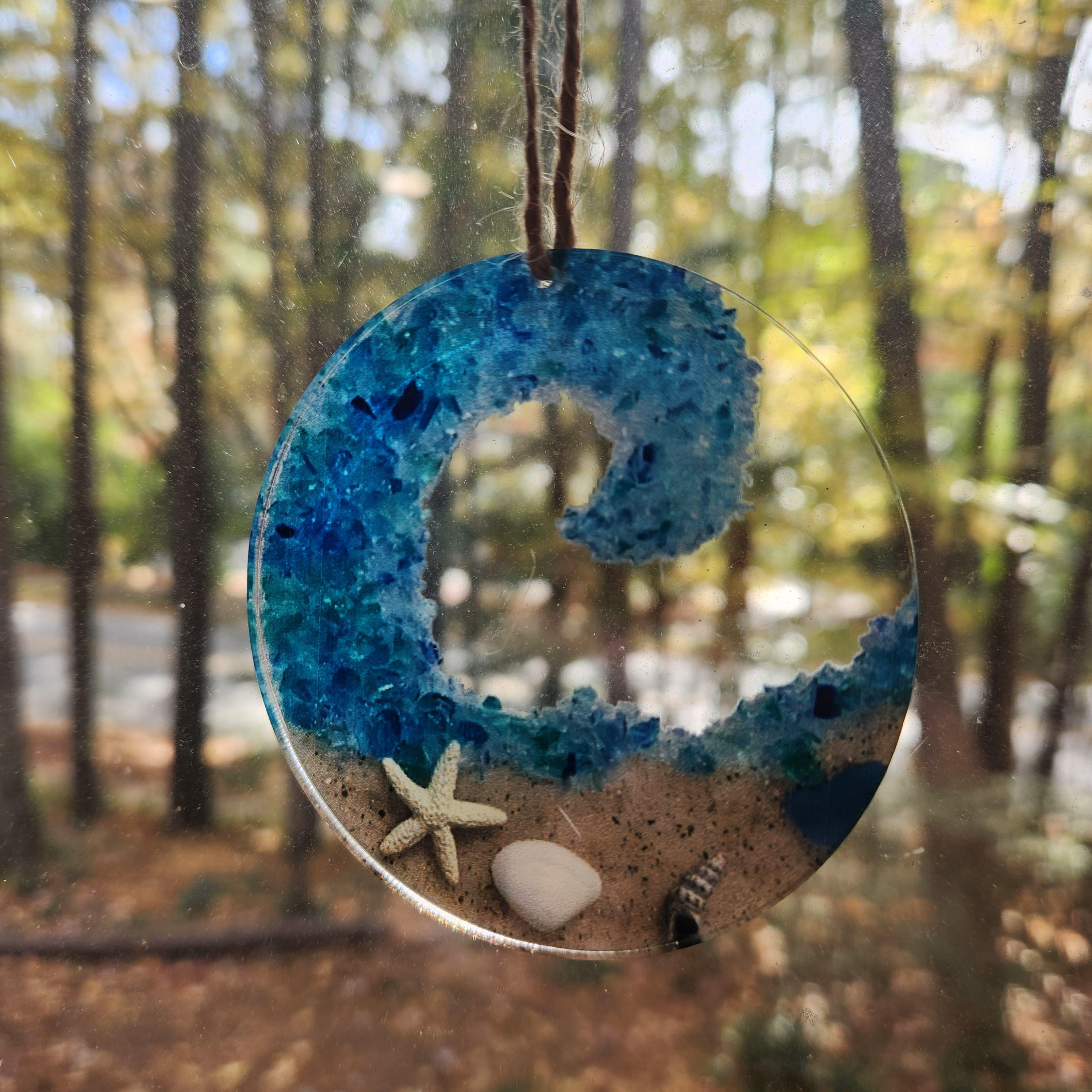 Bring the calming beauty of the seaside into your home with this ocean wave ornament. Designed to capture light beautifully, this round ornament features waves flowing into a sandy shoreline. Hang it in a sunny window, wall, or Christmas tree!