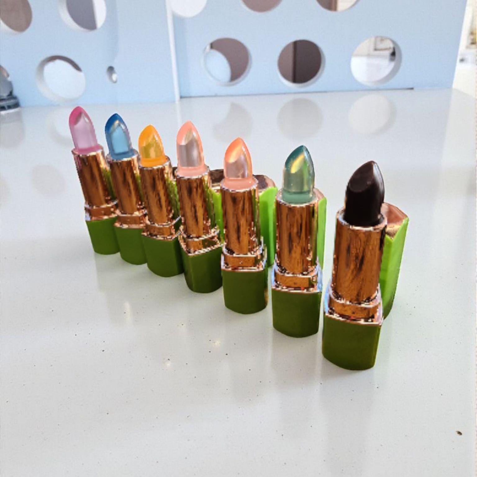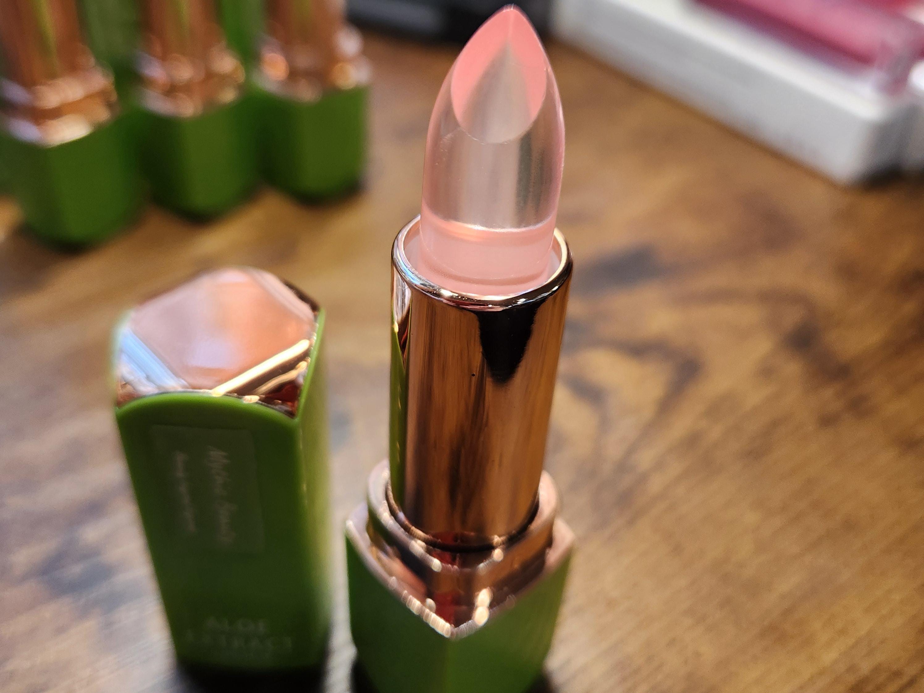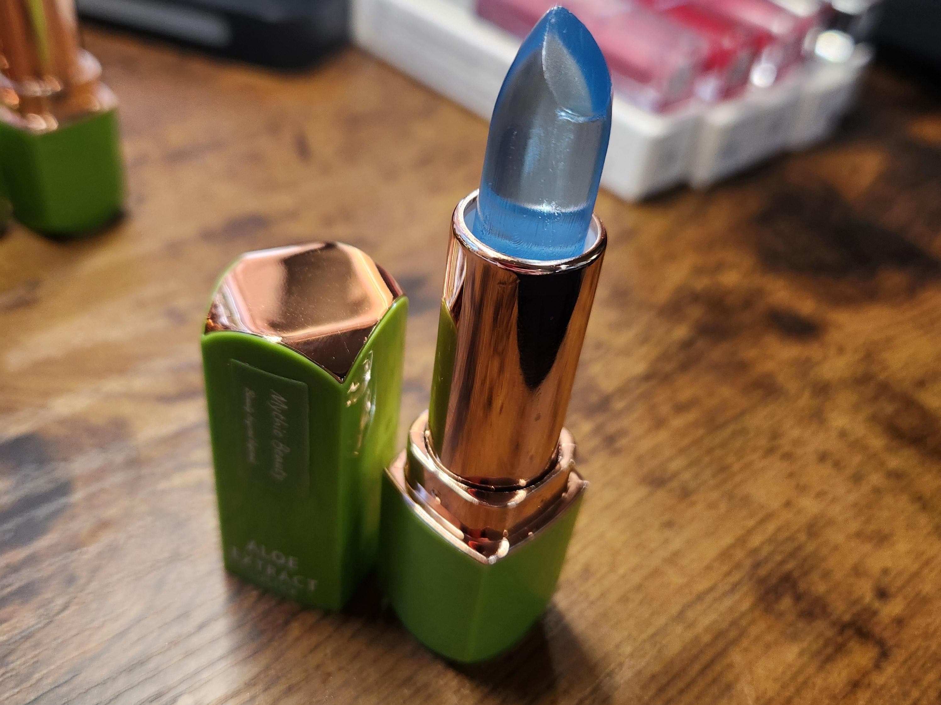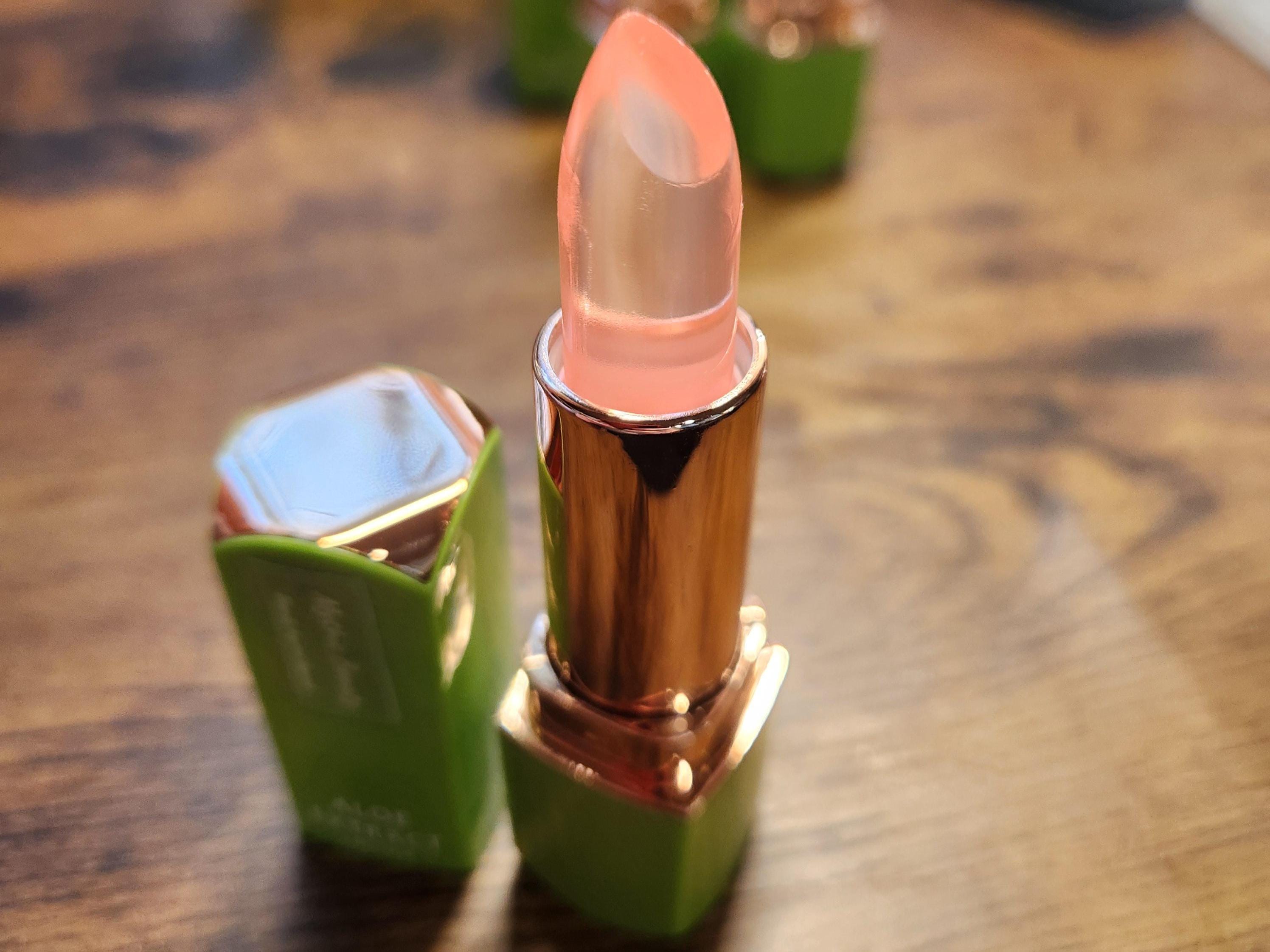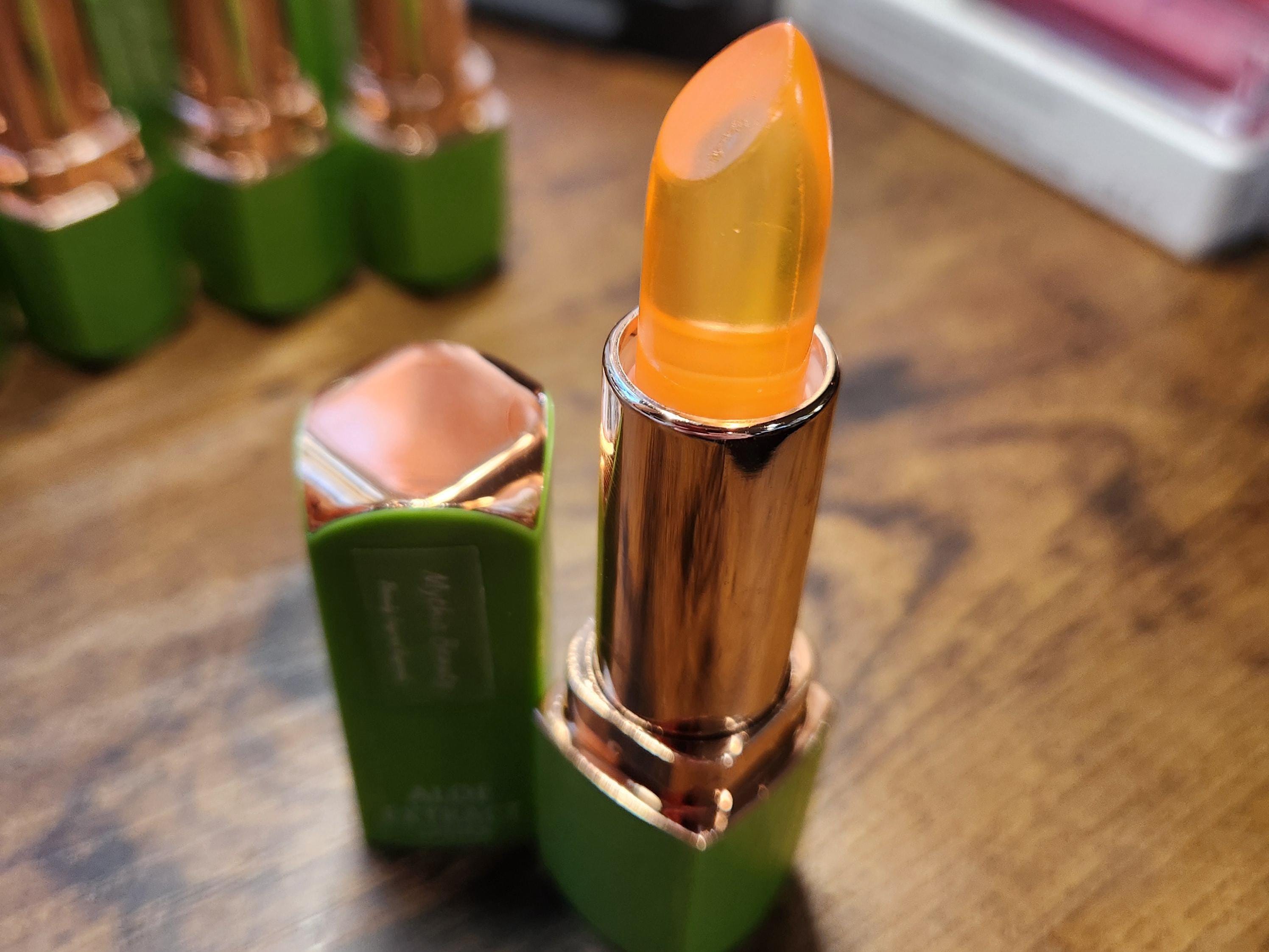 These Aloe Extract Jelly Lipsticks are unique and nourishing! Each color changes lips to a pinker shade, depending on your personal PH and body heat. Even the green, blue, and orange ones change to a pink shade. (See Swatches) All while providing the nourishing healing elements of aloe vera!