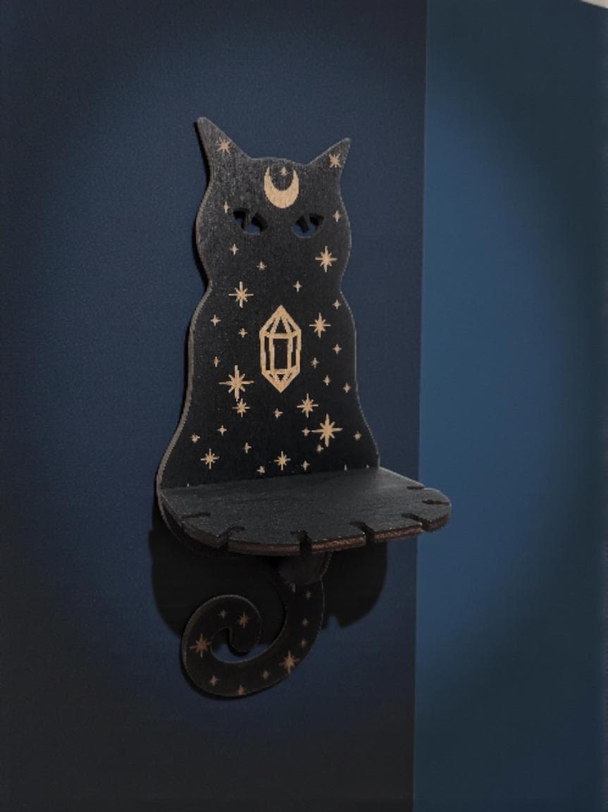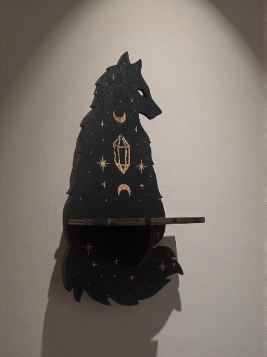 Add a touch of magic to your space with these enchanting mini wooden shelves- available in a celestial wolf or moonlit cat design. Perfect for holding crystals, small plants, essential oils, or various trinkets. Crafted from lightweight yet study laser-cut wood, these shelves bring a whimsical, witchy vibe to any wall. Perfect as a gift for spiritual, gothic, or fantasy-loving friends.