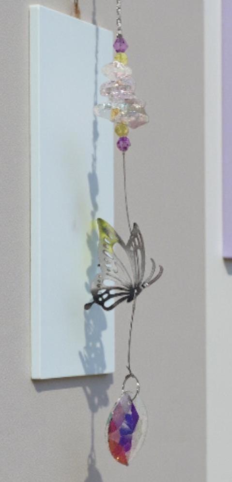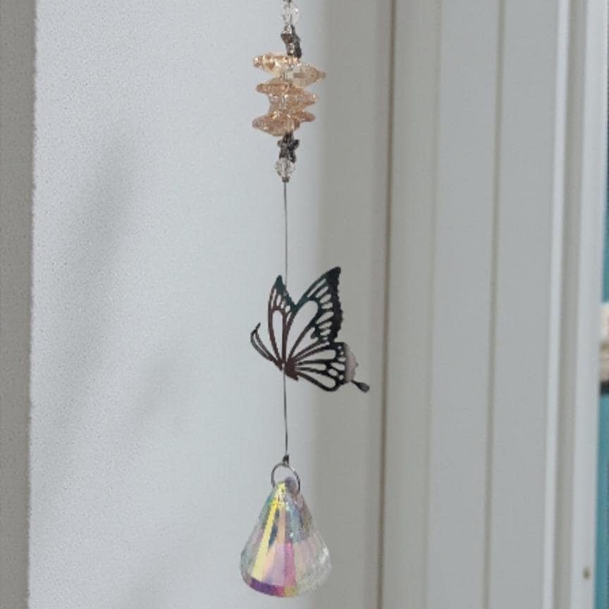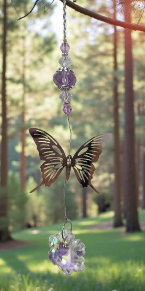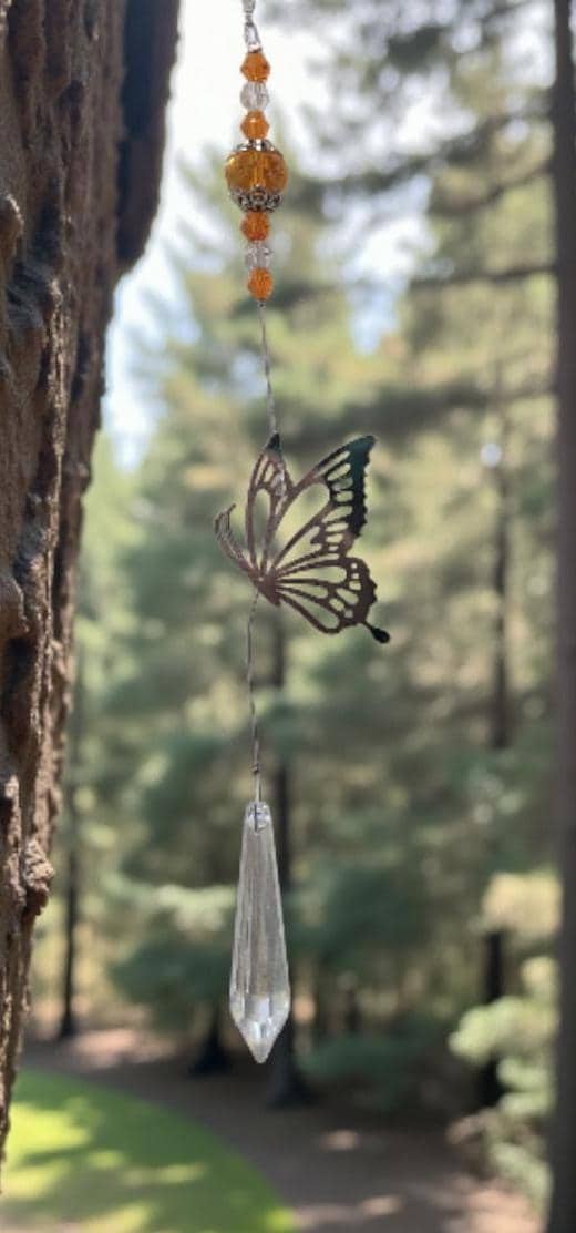 Handmade butterfly style suncatcher ornaments. Bring light, color, and a touch of magic into your space with each piece that scatters rainbow reflections across your walls, floors, and windows. Perfect as a suncatcher in window space, or as a hanging piece outdoors.
